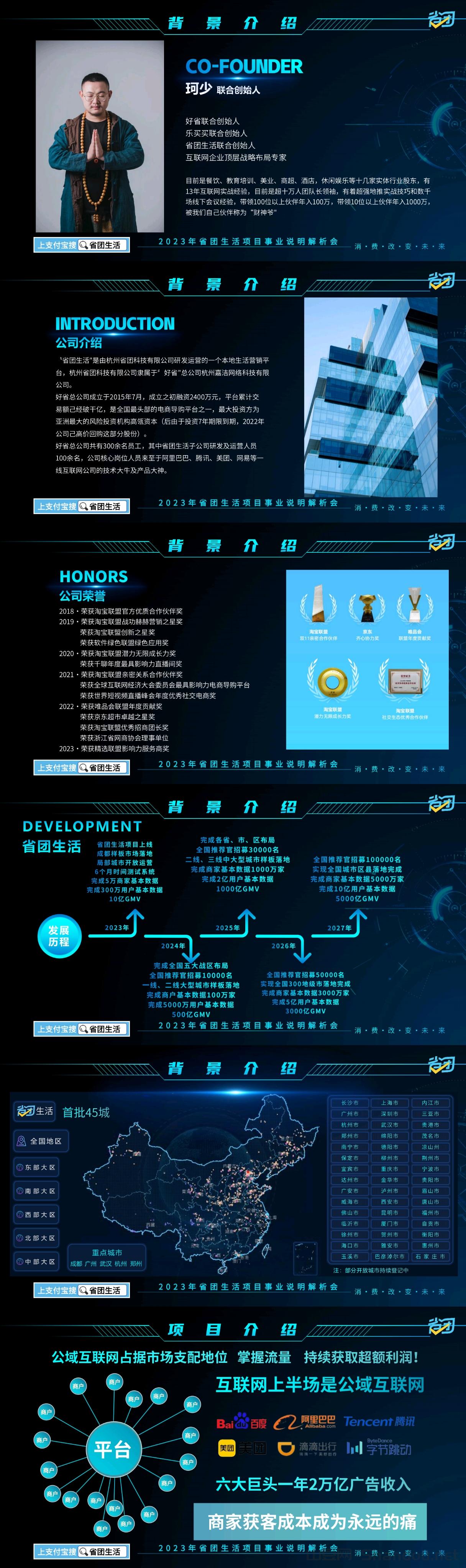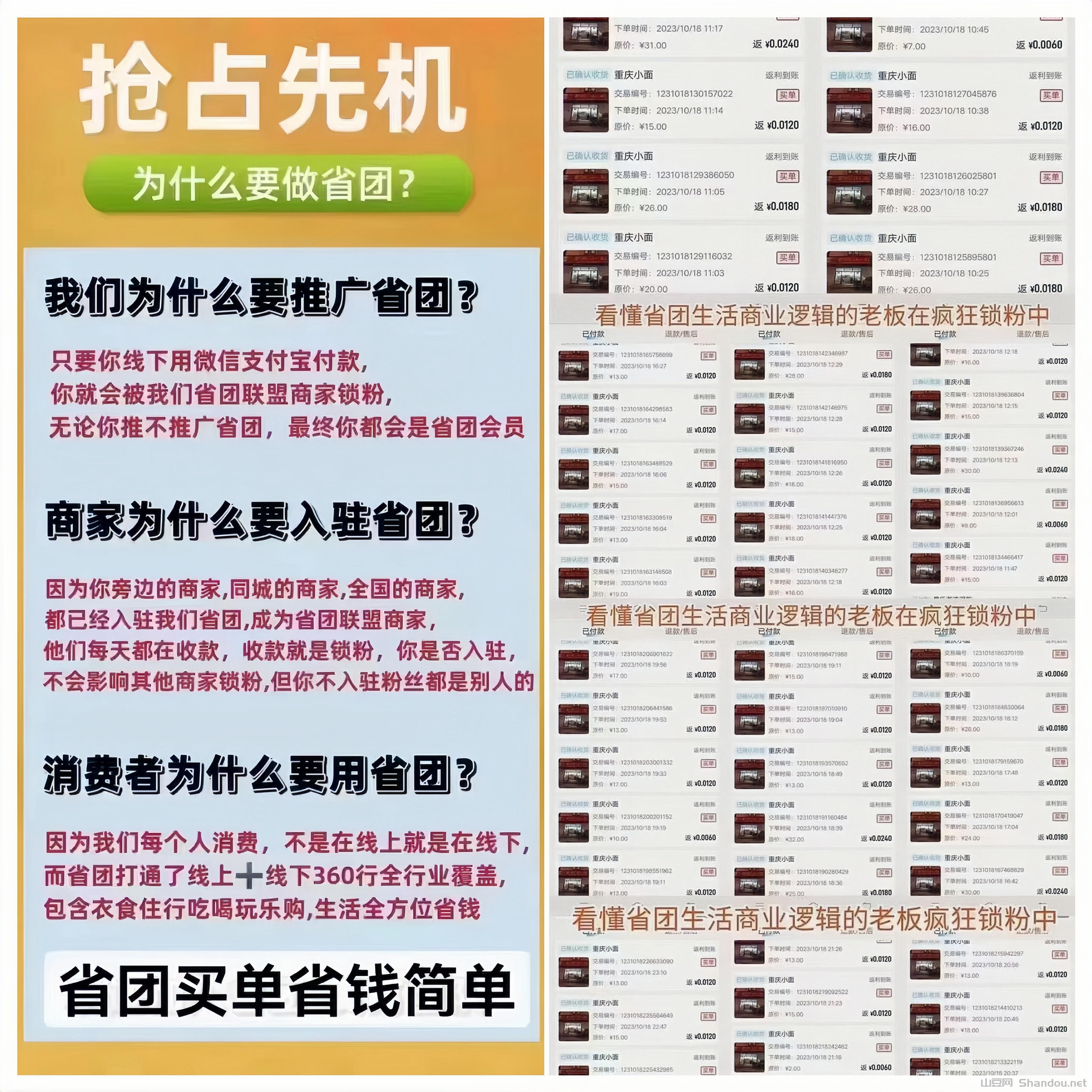商家入驻省团生活,顾客扫码无感锁粉,粉丝通过省团生活进入,淘宝,拼多多,美团外卖,饿了么,肯德基,麦当劳,星巴克,看电影,喝咖啡,买水果……等等场景消费,顾客领返利,商家有分润!