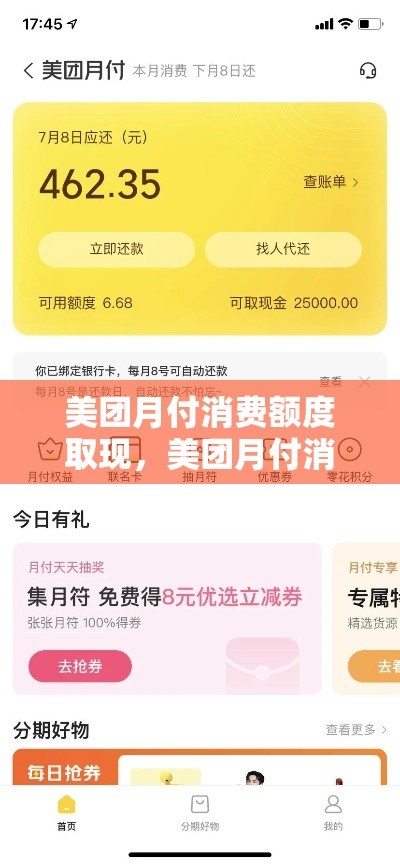 3、美团月付取现不可以分期。以下是关于美团月付取现及分期服务的详细解美团月付的基本功能与取现限制 美团月付是美团平台为用户提供的一种先消费、后付款的支付方式。用户可以在美团、外卖、大众点评等指定场景中使用美团月付额度进行消费。