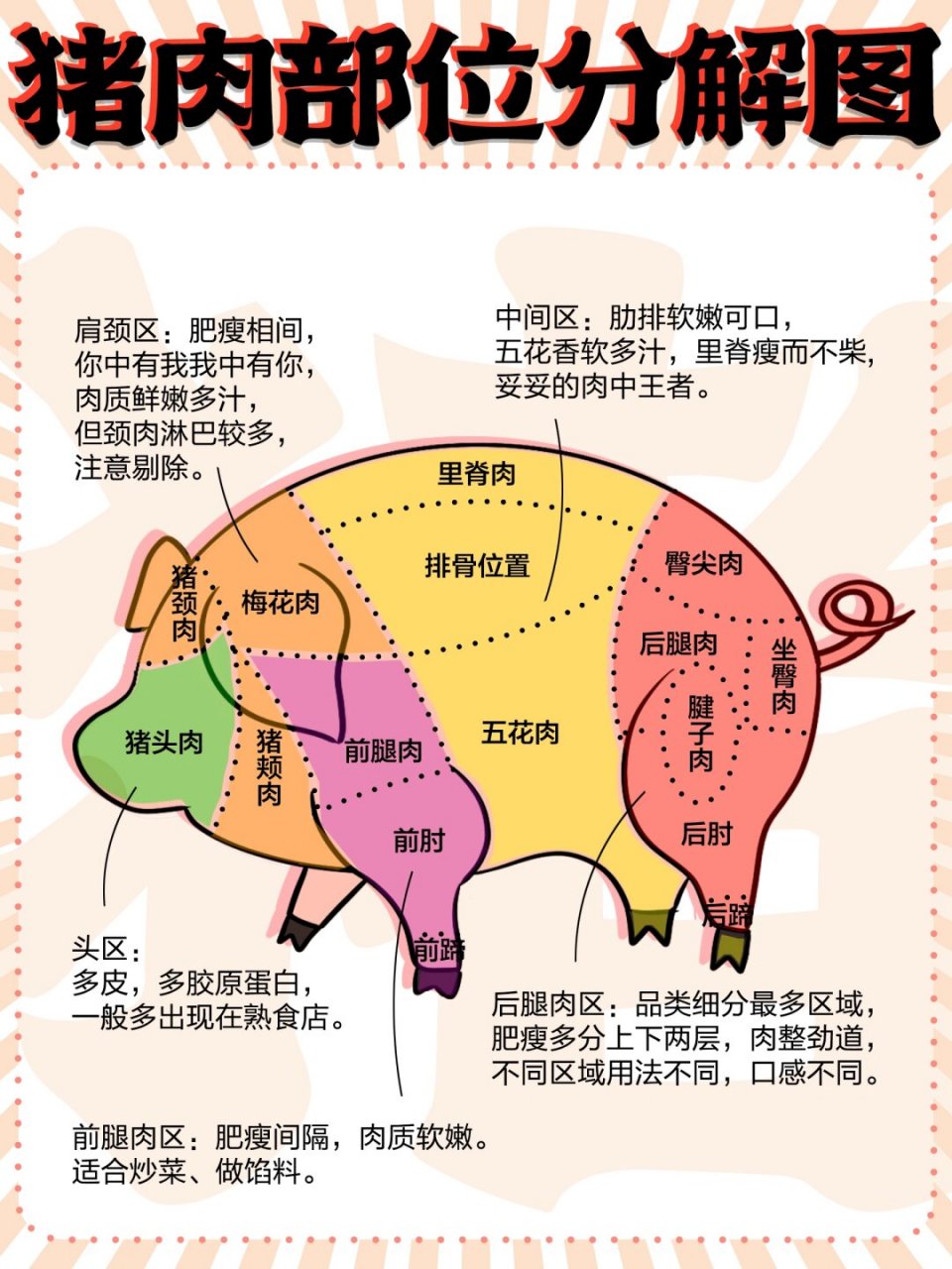 需要注意的是,不同的猪肉部位需要搭配合适的做法才能发挥出最佳口感,例如梅花肉适合香煎,里脊适合做成糖醋里脊,前腿肉适合包饺子。
